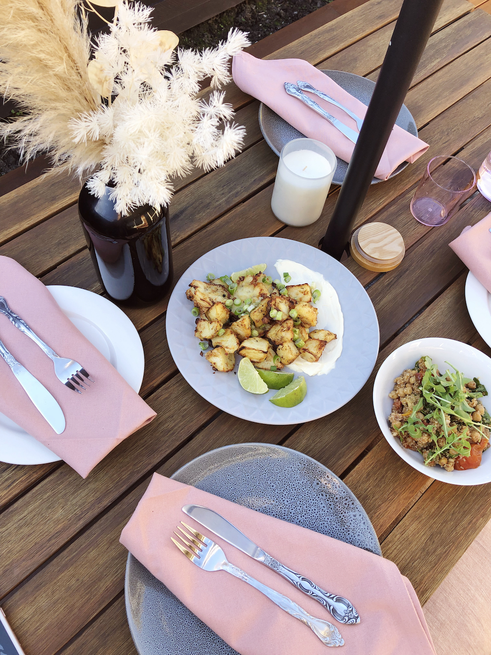 We often go all-out when hosting indoor dinner parties, so why not give our outdoor table the same love? Table settings help set the vibe of your BBQ party. Create a classic, elegant feel with glass tealight holders, or opt for simple styling with a linen tablecloth and foraged greenery. Theming your table setting, like going for a coastal
